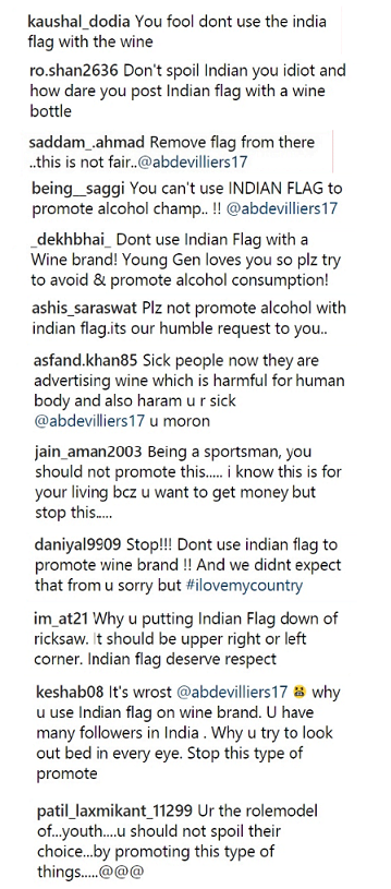De Villiers has immense fan-following in India and expectedly they weren’t pleased with him. They lashed out at the former South African cricketer for disrespecting the Indian flag. While few termed him as the role model of the young generation and he shouldn’t spoil his image by promoting wine brands, some thrashed him saying that they didn’t expect this from him.