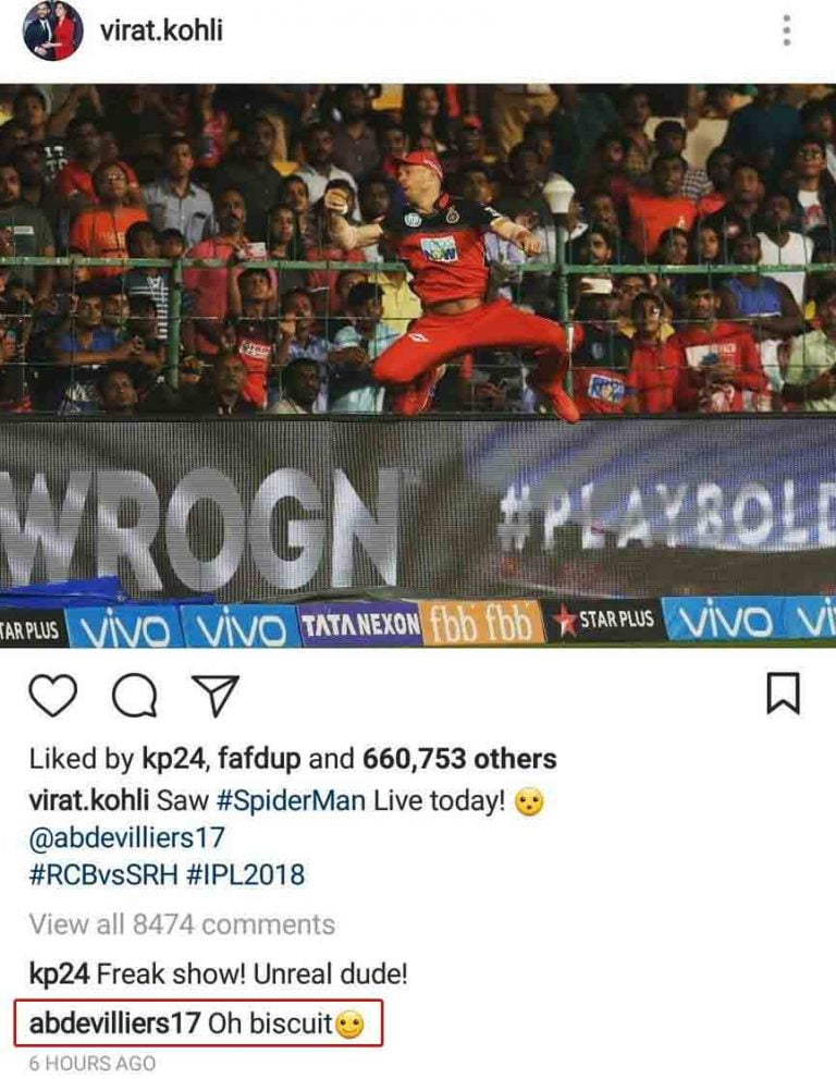 Virat reemphasized the same and took to his social media handles to post another update on the same. He posted a picture of a flying AB de Villiers and captioned him as Spider-Man again. He wrote:“Saw #SpiderMan Live today! @abdevilliers17 #RCBvsSRH #IPL2018″.