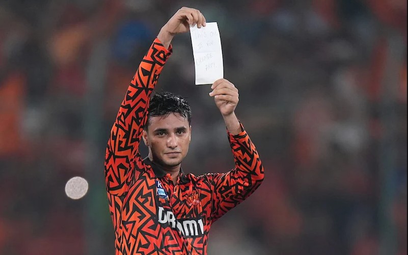 Abhishek’s milestone came off the bowling of Yuzvendra Chahal, and as soon as he raised his bat, the Uppal crowd erupted into a roar of appreciation. But what stole the show wasn’t just his breathtaking strokeplay—it was the heartfelt gesture that followed. Abhishek pulled out a white piece of paper from his pocket and proudly showed it to the stands.