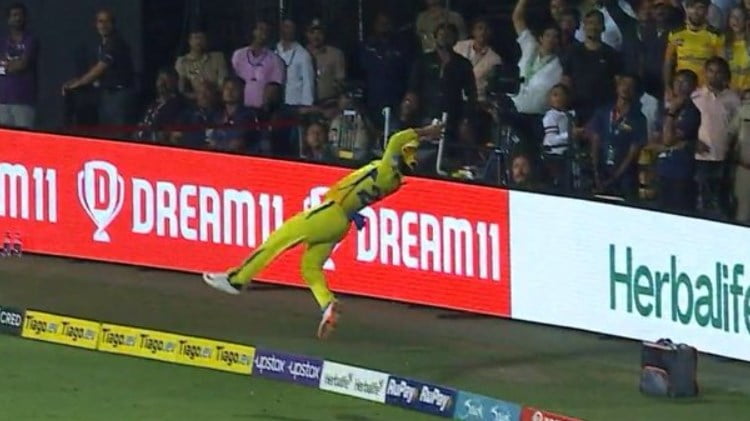 Replays showed that as the ball was sailing over Ajinkya Rahane’s head at long-off, the batter positioned himself at the edge of the ropes and executed a perfectly timed leap to grab the ball with both hands. Yet, Ajinkya Rahane seemed all set to fall across the boundary with the ball still in hand but somehow, he managed to let go of it with both his feet mid-air to produce potentially the best fielding effort of the season.