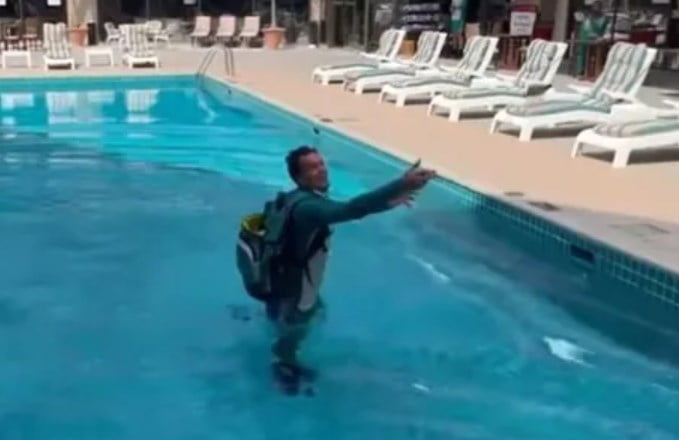 The full angle of Alex Carey falling into the pool at the team hotel in Karachi.