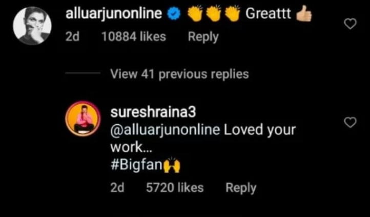 Commenting on the video, Allu Arjun wrote: “@sureshraina3 thank you sooo much . Sorry dint read your comment earlier…Elated to know that u liked my performance . Thank you soo much for your wishes and Likewise … More power to you . Humbled.”