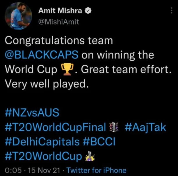 Amit Mishra took to Twitter and wrote, “Congratulations team @BLACKCAPS on winning the World Cup Trophy. Great team effort. Very well played. #NZvsAUS #T20WorldCupFinal #AajTak #DelhiCapitals #BCCI T20WorldCup.”