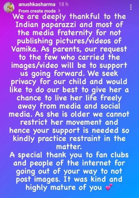 Anushka Sharma also urged the media for continuing such support regarding this matter and respect the privacy of her child and stated that she would like her daughter to live her life freely. She concluded by stating that it was highly mature of the paparazzi to not circulate pictures of her daughter.