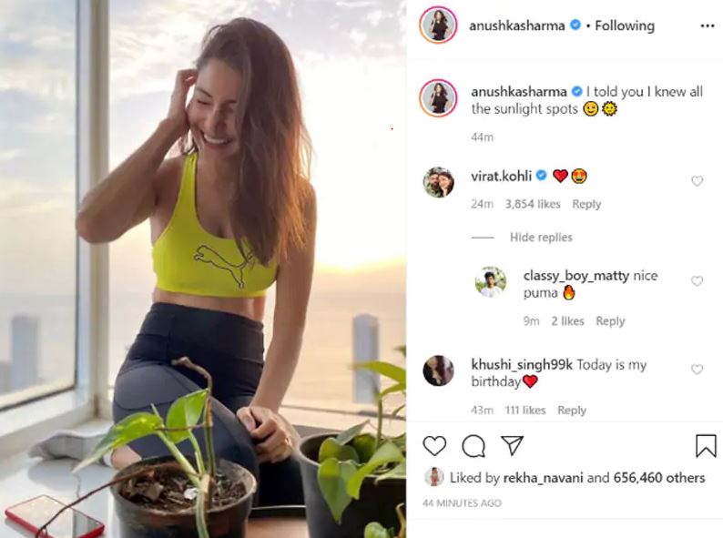 The Indian skipper, Virat Kohli took to Instagram to react to his wife Anushka Sharma’s latest Instagram picture. Anushka on Saturday posted a picture of herself, soaking in the sun. Captioning the picture on Instagram, Anushka wrote: “I told you I knew all the sunlight spots”.