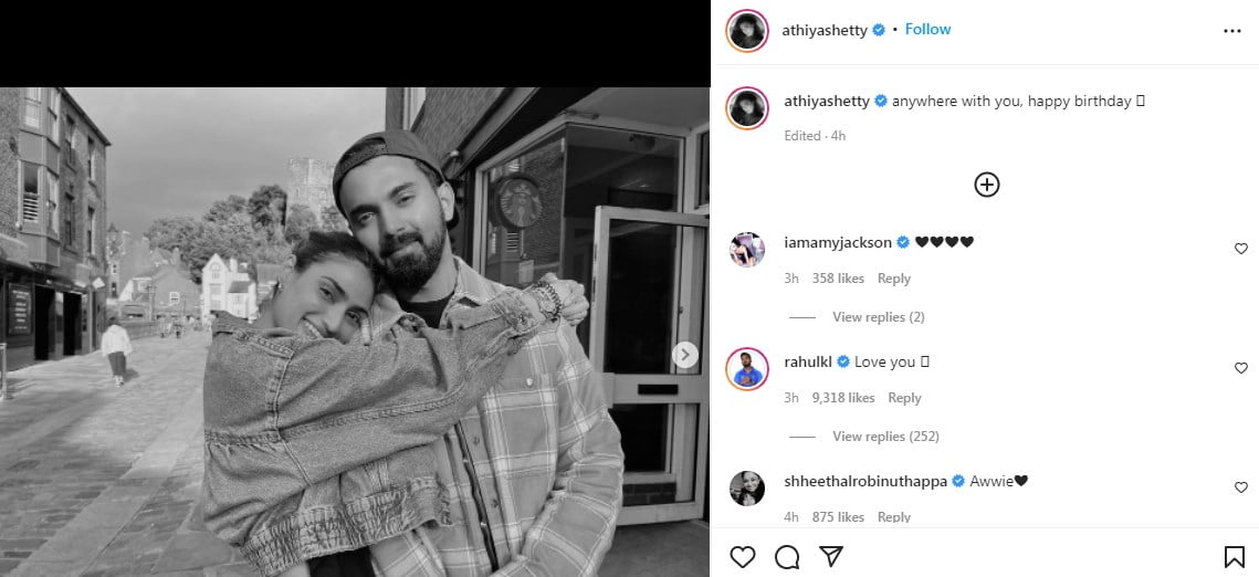 Athiya Shetty captioned her post, “Anywhere with you, happy birthday (smiling face with three hearts emoji).” Reacting to the post, KL Rahul commented, “Love you (black heart emoji).” Akansha Ranjan Kapoor commented, “Except another bubble.” Esha Gupta, Anushka Ranjan, Anusha Dandekar, and Amy Jackson posted red heart emojis.