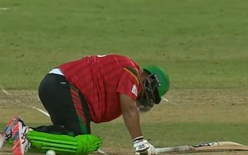 Tenth over, Azam Khan came to the crease, looking to make useful contributions towards his team’s chase. Unfortunately, a short-pitched delivery by pacer Shamar Springer found its target in the 12th over as Khan misjudged the length in pulling the ball. It hit him on the shoulder, rebounded onto his neck, and he lost his balance.