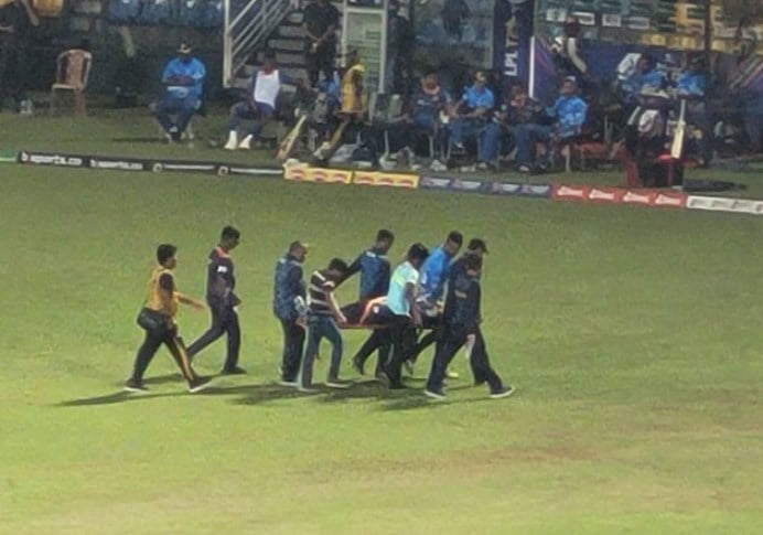 Galle Gladiators Wicket Keeper Azam Khan is carrying to the Hospital after hitting the ball in his head #sportspavilionlk #LPL2022 pic.twitter.com/4soWc7R376
