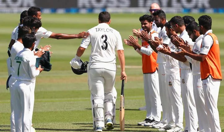 Ross Taylor is given a guard of honour as he makes his way out to bat for possibly the final time in Test cricket for New Zealand 🥺#NZvBAN pic.twitter.com/ejJjTo5w4v