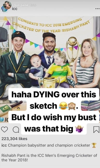 On Tuesday, the International Cricket Council (ICC) announced the awards for the year 2018 on Tuesday. While Virat Kohli swept the top three awards, the youngster Rishabh Pant won the Emerging Cricketer of the Year award for the sensational start to his Test career. More than that, the way in which the ICC congratulated him on social media has left many in splits and Tim Paine’s wife Bon Paine has loved it as well.