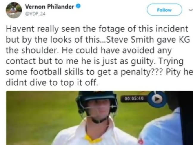 Earlier, Philander had expressed his views on Twitter saying, ‘Smith gave KG the shoulder’ and he ‘could have avoided any contact’. But he later withdrew the statement saying his account was hacked. However, the Australian opener has given hints that the African pacer might well have to deal with the consequences now.