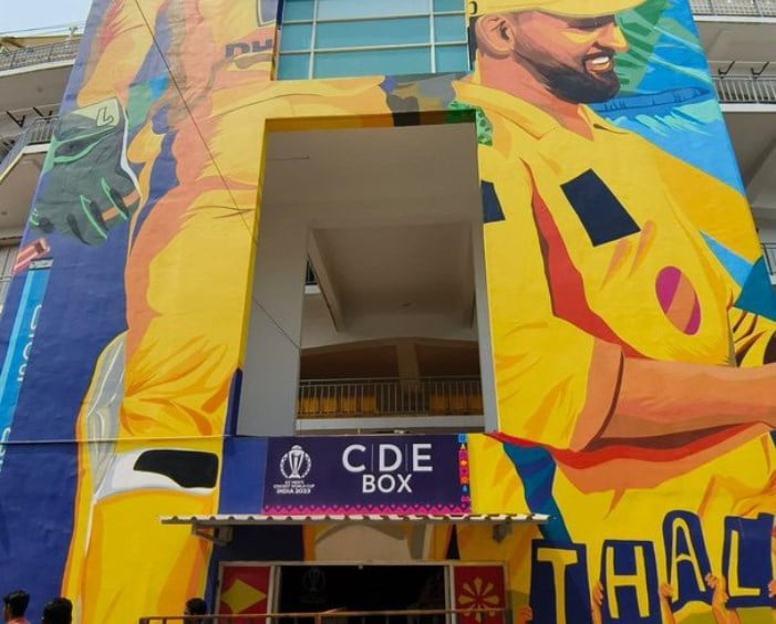 As anticipation mounts for the epic showdown between India and Australia in the ICC World Cup 2023, a striking sight at Chennai’s MA Chidambaram Stadium caught the attention of cricket fans worldwide. The CDE box in the stadium, affectionately known as the “Chepauk,” has been adorned in the iconic MS Dhoni yellow, and a large photograph of the legendary cricketer adds to the aura. The image quickly went viral on social media, showcasing the adoration for Dhoni in the hearts of Indian cricket enthusiasts.