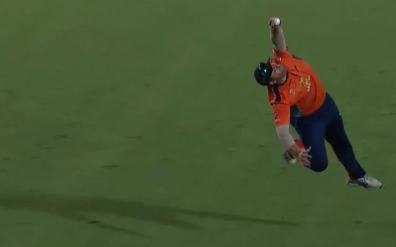 Within the fifth over, Texas had already put up 55 runs on the board with just 4.1 overs bowled by Carmi le Roux, who offered a back-of-a-length delivery, angling across Faf du Plessis and seemingly wide. The Texas skipper reached out and prodded, toe-ending the ball towards mid-off. Another day, it would have been beyond the fielder; this time, though, Corey Anderson read the trajectory perfectly. He waited, jumped superbly, and with his left hand pulled off a stunner of a catch.