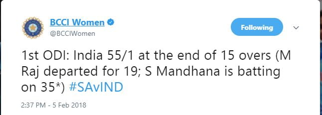 However, the official Twitter account of CSA shared that Mandhana was batting with Punam Raut, the regular Indian opening combination. This confusion lasted till the first wicket fell – Raut on 19 – with even the official BCCI handle tweeting that Raj fell. The tweet was later deleted and the scorecards corrected.