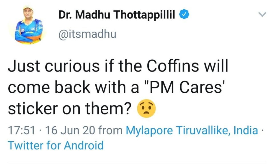 Indian Premier League (IPL) franchise Chennai Super Kings (CSK) terminated the services of its team doctor Madhu Thottappillil for one of his recent tweets after the death of 20 Indian Army personnel. On Wednesday, the s during a clash with Chinese troops in eastern Ladakh which was deemed to be in “bad taste” by the IPL franchise.