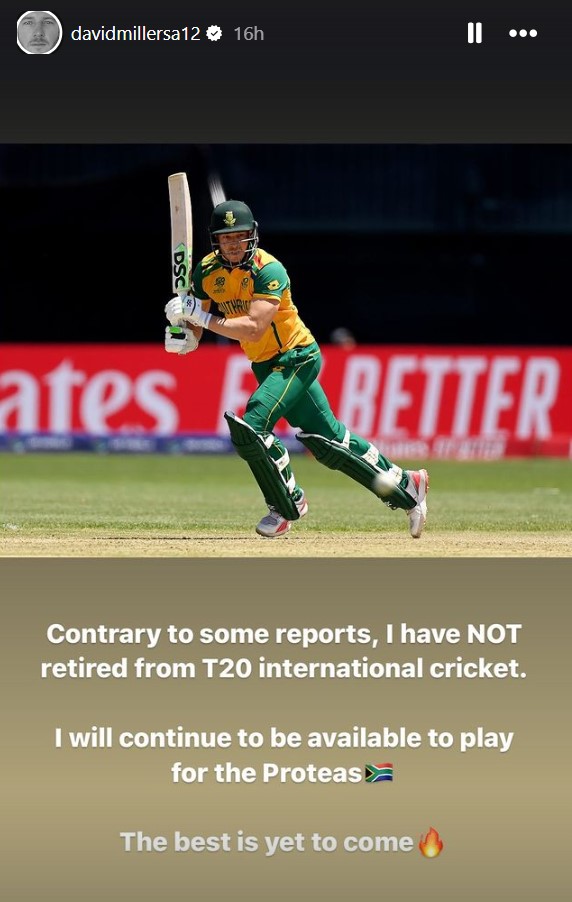 On July 2, David Miller took to Instagram to clear the air, unequivocally stating his intention to continue representing South Africa in the shortest format. “Contrary to reports, I have not retired from T20 international cricket. I will continue to be available for the Proteas. The best is yet to come,” he wrote, putting to rest any doubts about his future in T20Is.