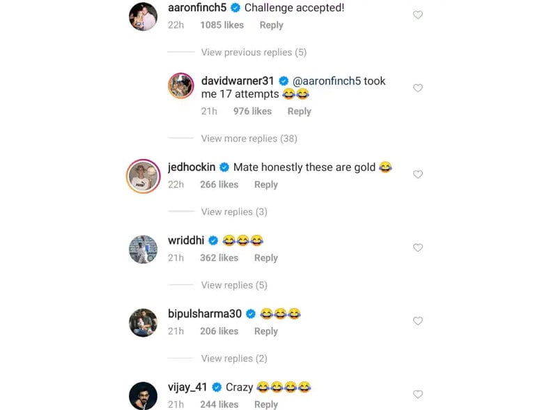 Captioning the video on Instagram, Warner asked Finch to “better this”, who duly accepted the challenge. Indian cricketers Wriddhiman Saha, Bipul Sharma, Vijay Shankar, all reacted with laughing emojis while Australian football star Tim Cahill also commented on the video.