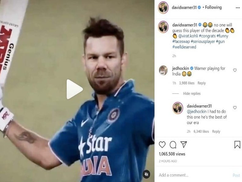 Captioning a funny video on his Instagram, Warner wrote: “No one will guess this player of the decade @virat.kohli #congrats #funny #faceswap #seriousplayer #gun #welldeserved”.
