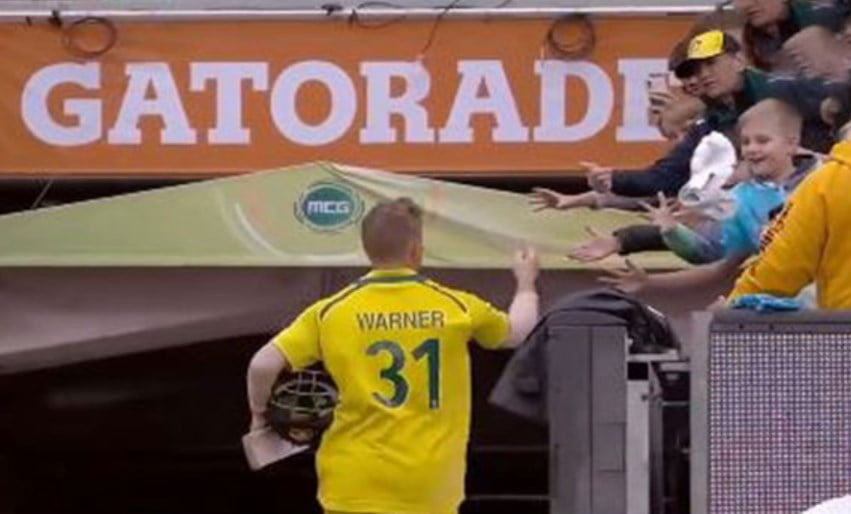 During the midst of the Australia batting innings, after getting dismissed, David Warner, who was returning back to the dugout after scoring a 102-ball 106, made a few young fans elated by his kind gesture.