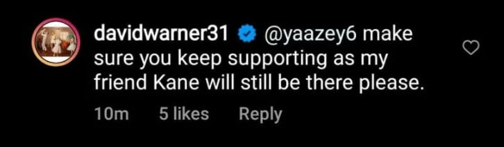 Meanwhile, David Warner reckoned that Kane may well resume his duties for the Orange Army in the upcoming season as well. Replying to a comment on Instagram, Warner wrote: “@yaazey6 make sure you keep supporting as my friend Kane will still be there, please.”