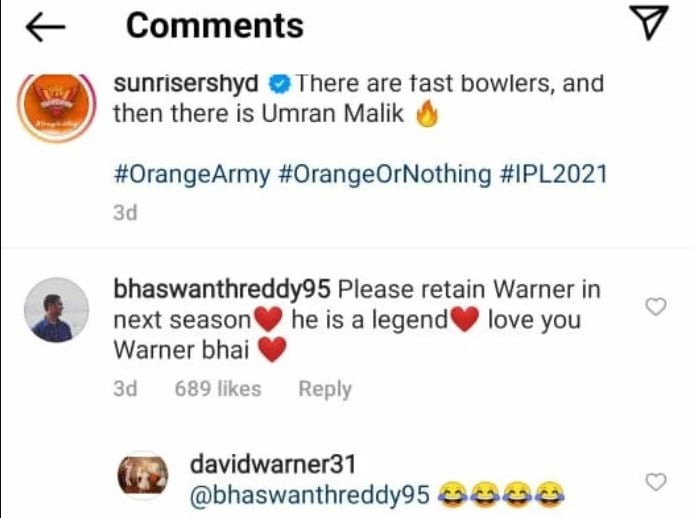 Meanwhile, a supporter wanted the Orange Army to retain David Warner ahead of the mega auction for the IPL 2022. He also called Warner a “legend. The fan took to Instagram and commented, “Please retain Warner n next season. He is a legend, love you Warner bhai.”