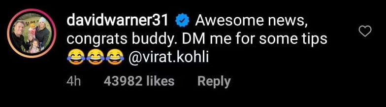 David Warner congratulated Virat Kohli in the comments box of his Instagram post. Mentioning the fantastic news before hilariously asking Virat to message him for some tips. Warner has three kids and all of them are daughters.
