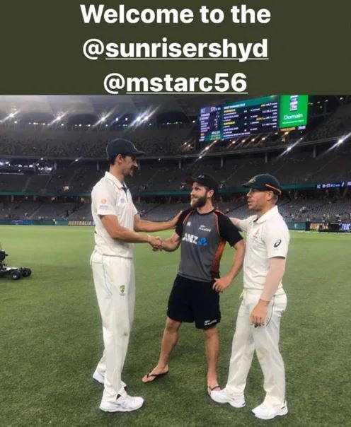 The veteran Australian pacer, Mitchell Starc, who had opted out of IPL 2020, was welcomed to the SunRisers Hyderabad (SRH) franchise by his Australia teammate David Warner in a bizarre Instagram post. After Australia beat New Zealand in the first Test on Sunday, David Warner shared a picture with the man-of-the-match Mitchell Starc and his SRH teammate Kane Williamson on his Instagram story.