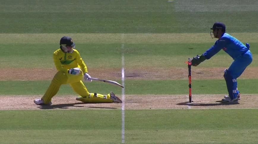 Jadeja was bowling the 28th over of the game in which he dismissed the dangerous looking Handscomb. The southpaw delivered a full ball on which Handscomb attempted a sweep shot, but he was beaten by the length. Jaddu made the ball spin fast past the off stump and Dhoni was quick enough to take well, who saw that Handscomb’s back foot was out of the crease and whipped the bails off and as soon as the batsman looked down and saw his foot was out he realized that he has to go back to the dressing room. Handscomb scored 20 off 22 balls before being dismissed by Jadeja.