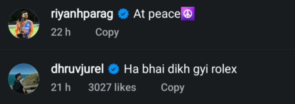 Yet, it was not the picture that became the sensation; it was that cheeky comment by his teammate Dhruv Jurel who stole the show. Jurel, Parag’s Rajasthan Royals teammate in the IPL, dropped a comment that read, “Ha bhai dikh gyi rolex.” Jurel’s light-hearted jibe at Parag’s apparent display of a Rolex watch in the post has received a deluge of amused reactions from fans online.