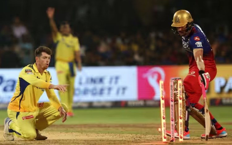Royal Challengers Bengaluru skipper Faf du Plessis faced an unfortunate dismissal in the team’s crucial match against Chennai Super Kings on Friday. The incident unfolded when Rajat Patidar drilled a tossed-up delivery from Mitchell Santner back towards the bowler. Santner managed to get a fingertip on the ball, which then deviated and struck the stumps.