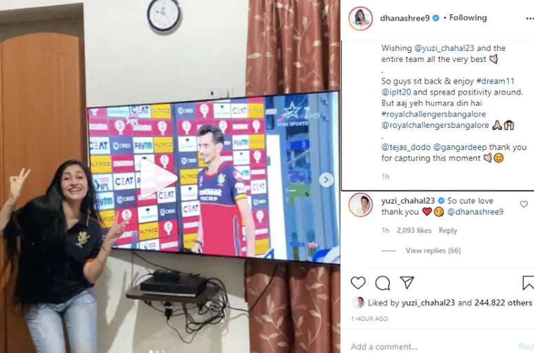 Chahal’s performance turned the game in his team’s favor and as he collected the man of the match trophy, his delighted fiance, Dhanashree Verma could not hold her emotions back and started clapping and jumping in front of the television set. All this was captured in a video which she later posted on her Instagram account.