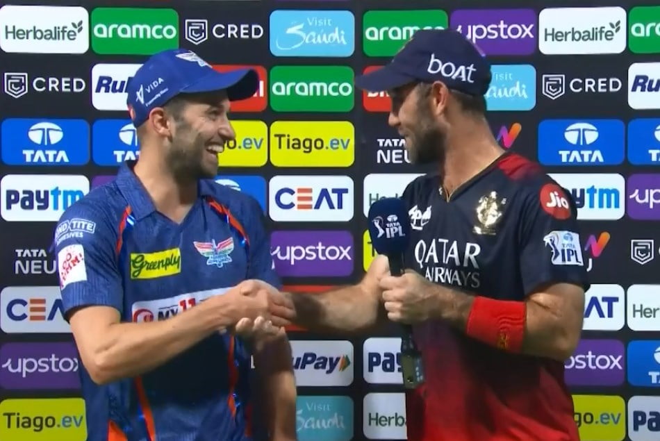 Royal Challengers Bangalore (RCB) posted a mammoth total of 212/1 on the board against Lucknow Super Giants (LSG), thanks to half-centuries from their star batting trio of Virat Kohli, Faf du Plessis and Glenn Maxwell at the M Chinnaswamy Stadium in Bengaluru. Star Aussie all-rounder Glenn Maxwell, who kept on smashing the LSG bowlers all-over the park, was involved in funny banter with English speedster Mark Wood during the mid-innings break.