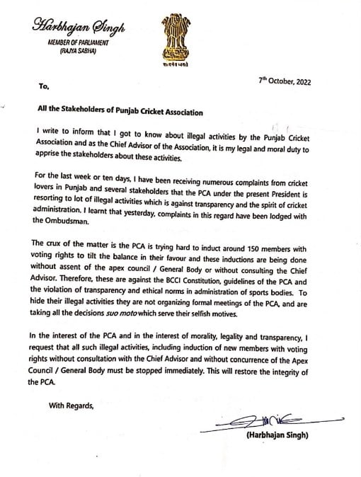 In his letter, Harbhajan Singh wrote:”For the last week or 10 days, I have been receiving numerous complaints from cricket lovers in Punjab and several stakeholders that the PCA under the present president is resorting to a lot of illegal activities, which is against transparency and the spirit of cricket administration. I learned that yesterday, complaints in this regard have been lodged with the Ombudsman.”