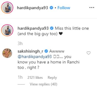 MS Dhoni’s wife who is close to the Indian cricketers and the allrounder reacted to it as she commented on it. Her comment read, “Awww Hardik Pandya, you know you have a home in Ranchi too, right?” It was heartwarming to also see Pandya’s rumored girlfriend Natasa Stankovic liked the post. Here is the screenshot of Sakshi’s comment: