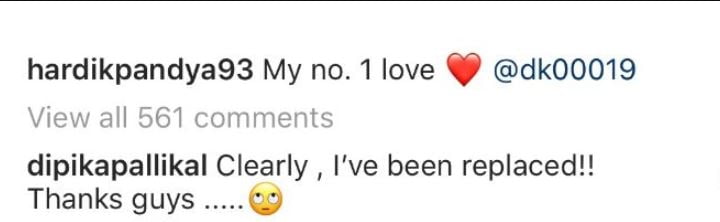But Pandya’s declaration has encouraged a sarcastic reply from Karthik’s beloved wife Dipika Palllikal. The squash player, in a comment, expressed her ‘disapproval’ on being replaced. “Clearly, I’ve been replaced. Thanks,” she wrote in a comment.