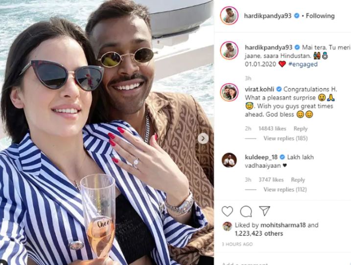 The flamboyant Indian all-rounder, Hardik Pandya announced engagement with Serbian actress Natasa Stankovic through an Instagram post on Wednesday. Captioning the post, Hardik wrote: “Mai tera, Tu meri jaane, saara Hindustan. 01.01.2020 #engaged”.