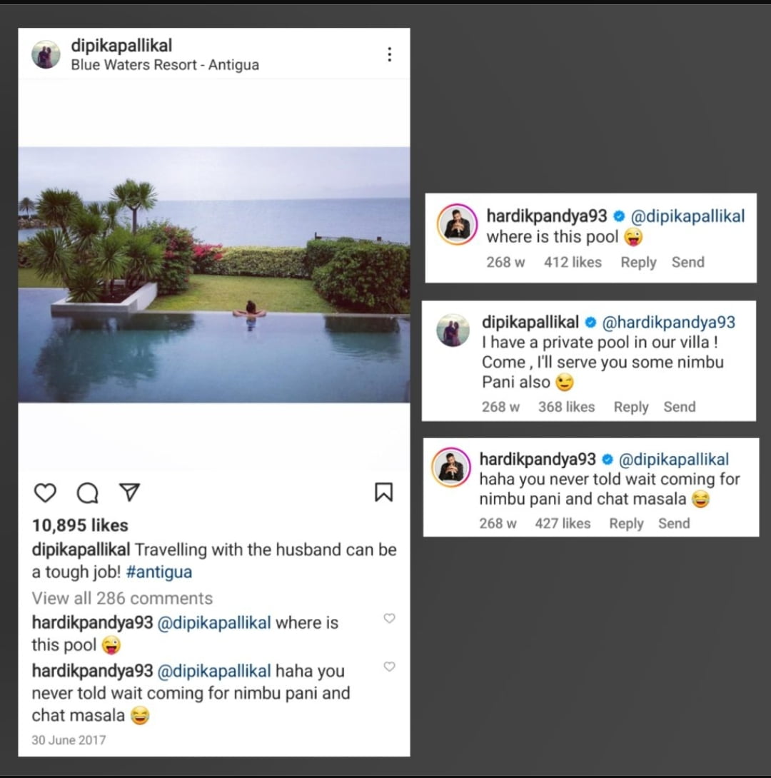 Indian all-rounder Hardik Pandya, out of curiosity, went on to ask Dipika about the location of the pool. “Where is the pool?”, Pandya commented on the picture that Dipika posted on Instagram. Dipika smartly replied to this without revealing their location. She wrote, “I have a private pool in our villa! Come, I’ll serve you some Nimbu Pani also.”