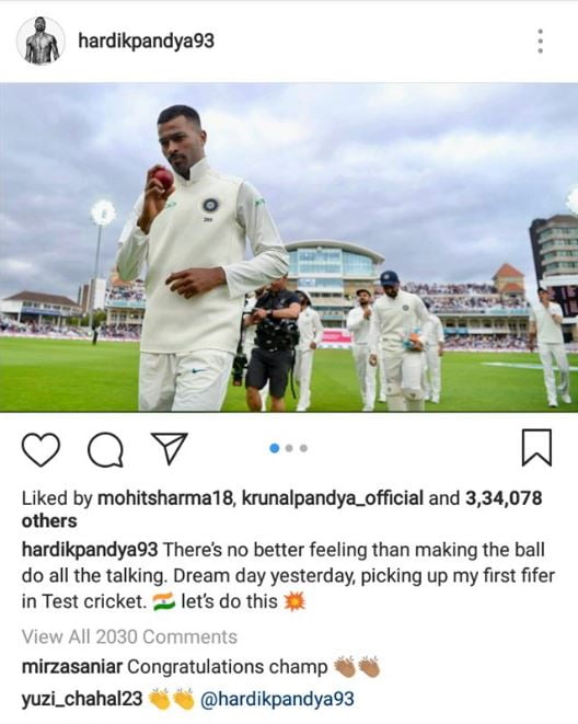 Soon, the picture received a lot of congratulatory wishes for the all-rounder. India’s ace tennis player, Sania Mirza also commented on his picture congratulating Hardik Pandya for taking his first fifer. Congratulating Hardik for his brilliant performance, Sania Mirza wrote: “Congratulations champ”. Even the young Indian spinner, Yuzvedra Chahal also commented with a couple of clap emojis.