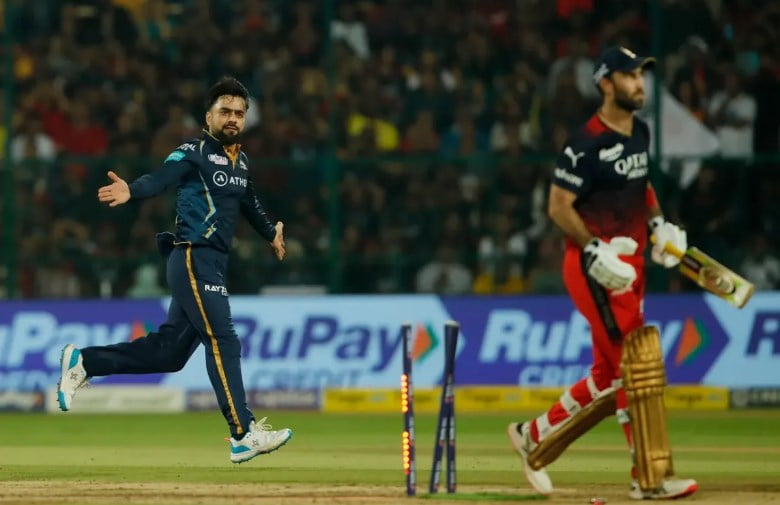 Halfway through the innings, Royal Challengers Bangalore (RCB) reached a score of 93/3 while batting first in the game against Gujarat Titans. RCB had got to a solid start while batting first but they lost three wickets after the powerplay including a crucial wicket of Glenn Maxwell as Rashid Khan cleaned him up.