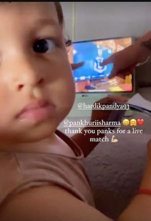 As soon as the computer screen showed Hardik gearing up to bowl, Natasa tried to guide Agastya to see his father. She asked Agastya to say “Dada”. For some time, Agastya was not interested in looking at the computer and concentrated on a book that he was holding. After a little more prodding from his mother, he recognized his father and said “Dada” but immediately immersed himself back into his book.