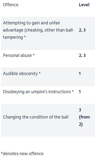 The maximum sanction for a Level 3 offense has been increased from eight suspension points to 12 suspension points (equivalent to 6 Test matches or 12 ODIs).