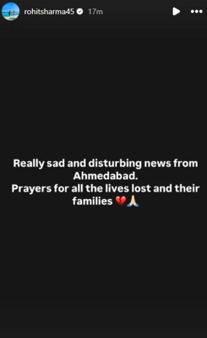 India’s ODI captain Rohit Sharma shared a message on Instagram: “Really sad and disturbing news from Ahmedabad. Prayers for all the lives lost and their families.”