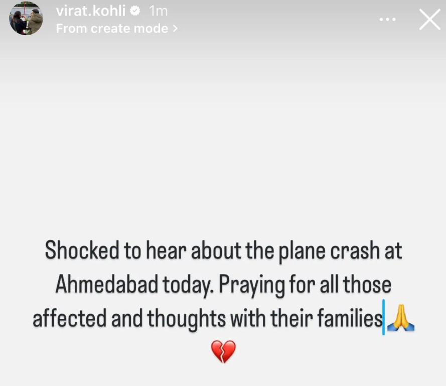 Former skipper Virat Kohli wrote, “Shocked to hear about the plane crash at Ahmedabad today. Praying for all those affected and thoughts with their families.”
