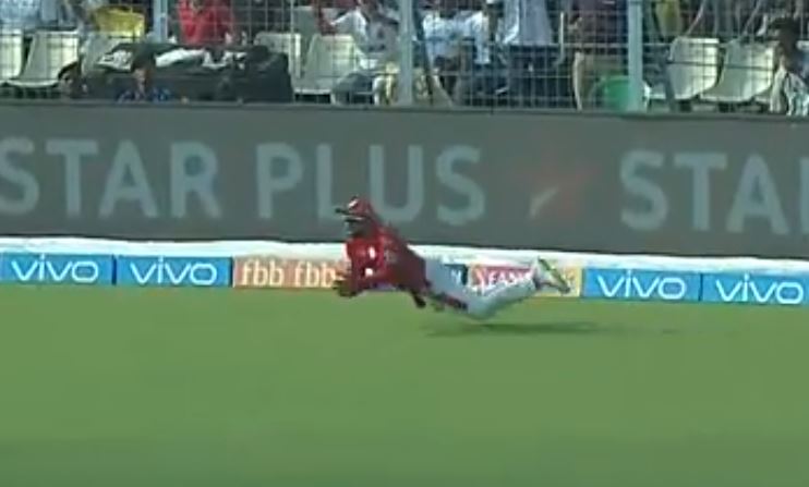In the third delivery of Mujeeb Ur Rahman’s first over, Sunil Narine tried to take on the teenager. He stepped out to play a big shot against a back of the hand delivery bowled by Rahman. Not timing the ball to his liking, he hit the ball to Karun Nair, who ran forward and timed his jump to perfection to complete a sensational catch.