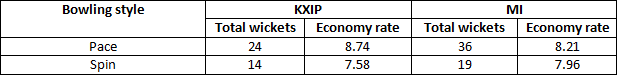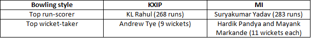 (Notes: excluded the over-reduction innings. For KXIP: excluded their away game against Kolkata Knight Riders.)