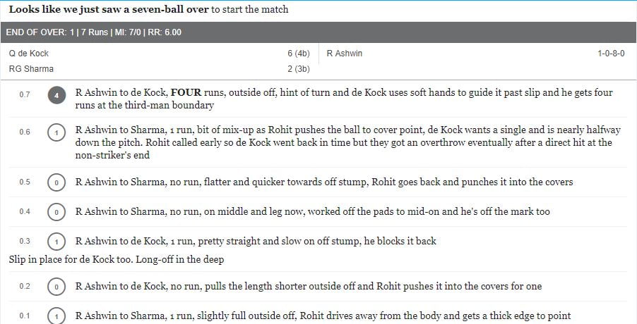 After winning the toss, the KXIP skipper, R Ashwin decided to bowl first and he opened the bowling with Mohammed Shami. He decided to bowl the first over of the match and he bowled seven balls to MI openers, Rohit Sharma and Quinton de Kock. The umpire somehow missed the fact that Ashwin had already bowled six deliveries. Before he was hit for a boundary by de Kock off the seventh ball.