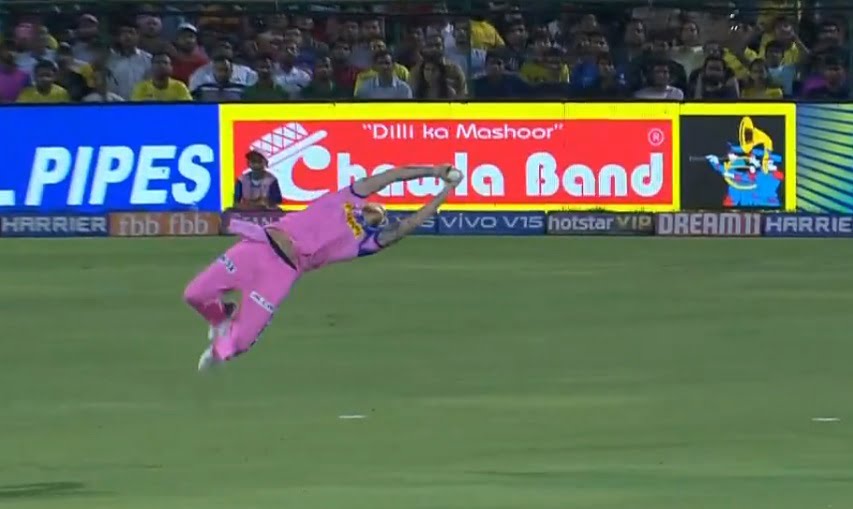 Jofra Archer getting dismissed Kedar Jadhav in the 6th over the with the help of flying Ben Stokes. On the penultimate ball of the over, Stokes took a brilliant catch. Jadhav played a fierce cut shot a short pitch delivery bowled by Archer and Stokes leaped and flew towards his left to pluck the ball out of thin air with both his hands at backward point. H kept his shape too as he came down to the floor to hold on to the ball.