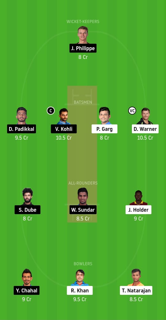 Josh Philippe, David Warner (vc), Devdutt Padikkal, Virat Kohli (c), Priyam Garg, Washington Sundar, Jason Holder, Shivam Dube, Rashid Khan, Yuzvendra Chahal, and T. Natarajan