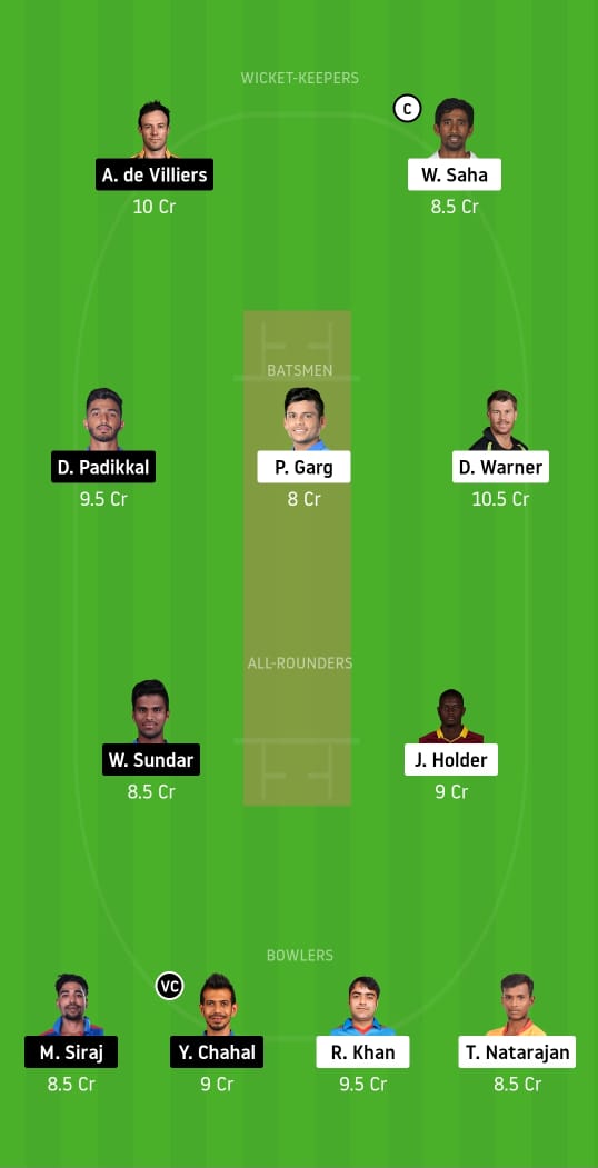 Wriddhiman Saha (c), David Warner, Devdutt Padikkal, AB de Villiers, Priyam Garg, Washington Sundar, Jason Holder, Mohammed Siraj, Rashid Khan, Yuzvendra Chahal (vc), and T. Natarajan