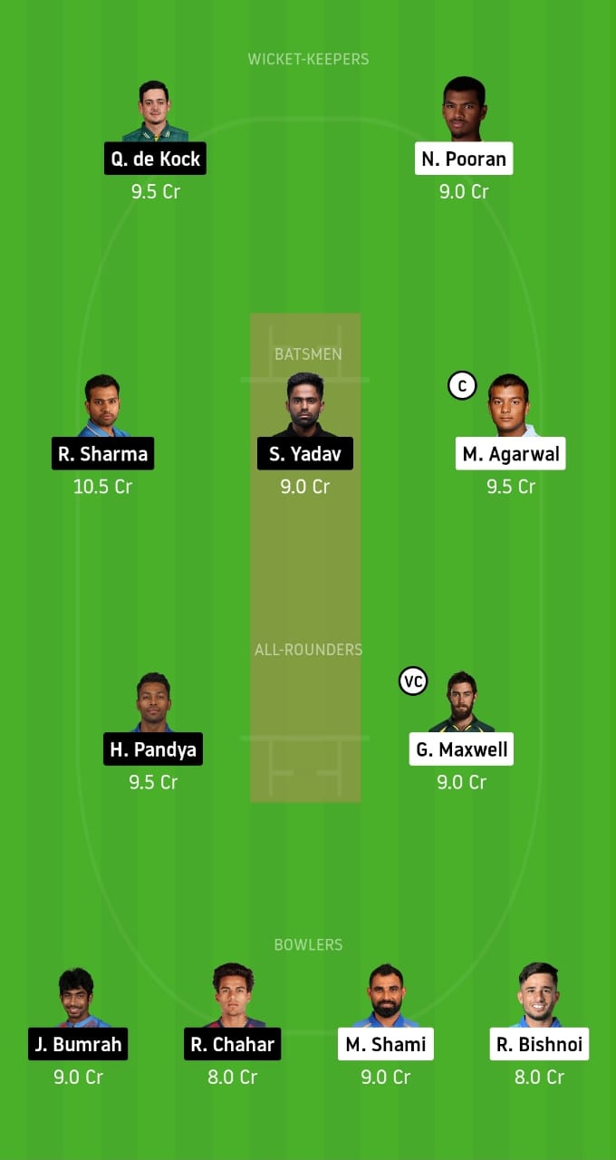Quinton de Kock, Nicholas Pooran, Mayank Agarwal (vc), Rohit Sharma, Suryakumar Yadav, Hardik Pandya, Glenn Maxwell (vc), Mohammed Shami, Jasprit Bumrah, Ravi Bishnoi, and Rahul Chahar